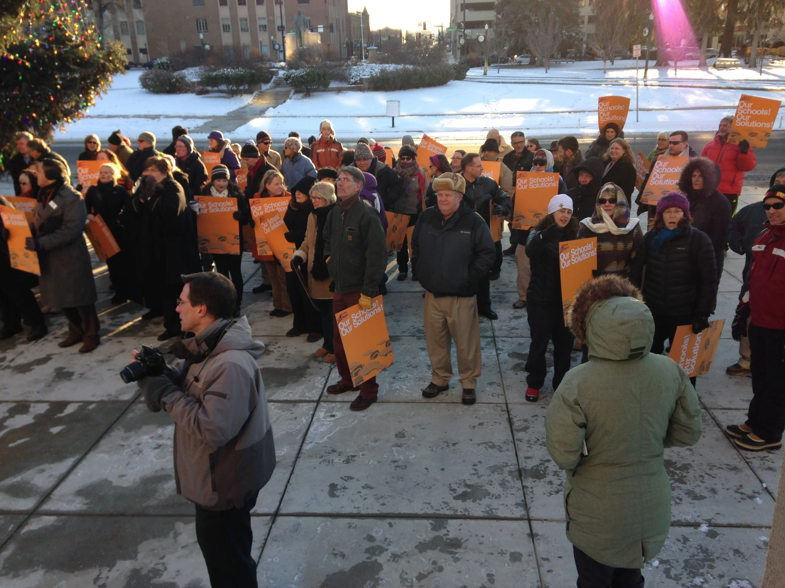 Karen Gillette bundled up and held an orange sign that read “Our Schools! Our Solutions!” next to more than 50 other teachers, parents and school administrators on the steps of the state capitol the afternoon of Dec. 9. She didn’t care that it was 14 degrees outside. She came to the Idaho Education Association’s Day of Action rally to support her colleagues, her school district and public education in her state.